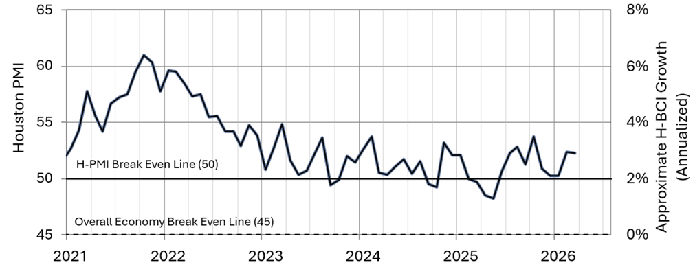Houston PMI readings over fifty indicate that respondents see their activities as expanding. An H-PMI above 45 normally correlates with expansion of the Houston-The Woodlands-Sugar Land Business Cycle Index.